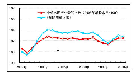 景氣:2010年一季度中經(jīng)水泥產(chǎn)業(yè)①景氣指數(shù)為102.5點(diǎn)(2005年增長(zhǎng)水平=100②),比上季度上升0.5點(diǎn),保持平穩(wěn)運(yùn)行態(tài)勢(shì)。
