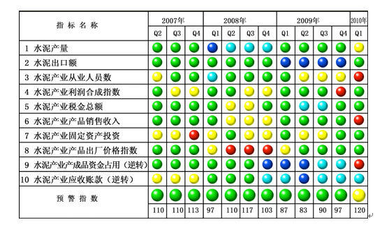 燈號(hào):2010年一季度,在構(gòu)成水泥產(chǎn)業(yè)預(yù)警指數(shù)的10個(gè)指標(biāo)(僅剔除季節(jié)因素,保留隨機(jī)因素)中,位于“綠燈區(qū)”的有5個(gè)指標(biāo)――――水泥出口額、水泥產(chǎn)業(yè)利潤(rùn)合成指數(shù)、稅收、投資總額以及出廠價(jià)格指數(shù);位于“淺藍(lán)燈區(qū)”的有1個(gè)指標(biāo)――――水泥產(chǎn)業(yè)應(yīng)收賬款(逆轉(zhuǎn)⑤);位于“黃燈區(qū)”的有1個(gè)指標(biāo)―――水泥產(chǎn)量;位于“紅燈區(qū)”的有3個(gè)指標(biāo)――――水泥產(chǎn)業(yè)從業(yè)人員數(shù)、產(chǎn)品銷售收入和產(chǎn)成品資金占用(逆轉(zhuǎn))。數(shù)據(jù)顯示,除水泥產(chǎn)業(yè)應(yīng)收賬款有所增加之外,反映水泥產(chǎn)業(yè)生產(chǎn)經(jīng)營(yíng)的多個(gè)指標(biāo)同比增速都有較大的提高,此外水泥出口額開(kāi)始回升,表明水泥產(chǎn)業(yè)的外部需求正處于恢復(fù)性增長(zhǎng)。