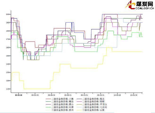山西呂梁二級(jí)冶金焦1850元/噸,準(zhǔn)一級(jí)冶金焦1950元/噸,均為出廠含稅價(jià);臨汾一級(jí)冶金焦現(xiàn)車板含稅價(jià)1980元/噸,準(zhǔn)一級(jí)冶金焦車板含稅價(jià)1950元/噸,二級(jí)冶金焦出廠含稅價(jià)1780元/噸;長(zhǎng)治二級(jí)冶金焦出廠含稅價(jià)1750元/噸,一級(jí)冶金焦?jié)q車板含稅價(jià)1900元/噸;介休二級(jí)冶金焦出廠含稅價(jià) 1800元/噸,一級(jí)冶金焦出廠含稅價(jià)1900元/噸。河南濟(jì)源地區(qū)二級(jí)冶金焦車板含稅價(jià)1900元/噸;安陽(yáng)地區(qū)二級(jí)冶金焦出廠含稅價(jià)1900元/噸;平頂山地區(qū)大型主導(dǎo)焦化企業(yè)二級(jí)冶金焦出廠含稅價(jià)1850-1900元/噸左右。河北地區(qū)邢臺(tái)二級(jí)冶金焦到廠含稅價(jià)1950元/噸;邯鄲準(zhǔn)一級(jí)到廠價(jià)1980-2000元/噸,二級(jí)冶金焦含稅出廠價(jià)在1900-1920元/噸;唐山二級(jí)冶金焦到廠價(jià)1930/噸。安徽淮南、淮北地區(qū)二級(jí)冶金焦含稅價(jià)格1900-1950元/噸。四川攀枝花地區(qū)二級(jí)冶金焦主流價(jià)格在1750元/噸。貴州六盤水地區(qū)二級(jí)冶金焦出廠價(jià)格1800元/噸。山東淄博二級(jí)冶金焦出廠含稅價(jià)1900元/噸;東阿地區(qū)國(guó)標(biāo)一級(jí)冶金焦出廠含稅價(jià)2100-2200。上海二級(jí)冶金焦含稅價(jià)格2020元/噸。