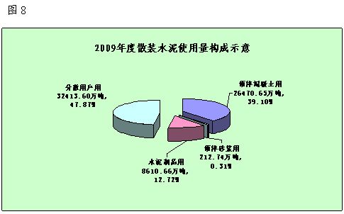 2009年全國(guó)散裝水泥使用量為67707.65萬(wàn)噸(不含出口和中轉(zhuǎn)儲(chǔ)存環(huán)節(jié)的數(shù)量),比去年同期增加7309.19萬(wàn)噸。其中:預(yù)拌混凝土使用量為26470.65萬(wàn)噸,增加4242.84萬(wàn)噸;預(yù)拌砂漿使用212.74萬(wàn)噸,增加127.33萬(wàn)噸;水泥制品使用8610.66萬(wàn)噸,減少 2233.8萬(wàn)噸;分散用戶(hù)使用32413.6萬(wàn)噸,增加5203.66萬(wàn)噸;增長(zhǎng)率分別為19.09%、149.08%、-20.6%和19.12%。