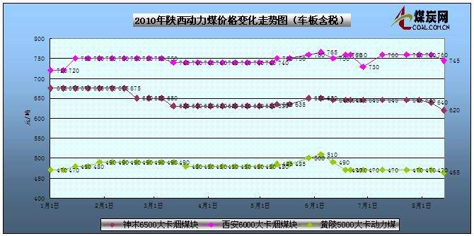本周陜西煤炭市場價(jià)格小幅下降,由于近期港口煤炭價(jià)格小幅回落,西北地區(qū)坑口價(jià)仍繼續(xù)維穩(wěn),由于仍處在迎峰度夏關(guān)鍵期,成交還好。該地區(qū)受市場波動(dòng)不大,主要是西北地處偏僻,主要以地銷為主。陜西神木礦區(qū)6000大卡煙煤末車板含稅價(jià)下跌15元/噸至465元/噸;神木38塊Q6500以上西安貨場不含稅價(jià)715元/噸。