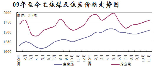 圖1:2009-2010年11月山西主焦煤及焦炭月度價(jià)格示意圖
