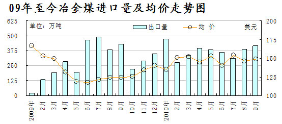 圖5:2009-2010年9月冶金煤月度進(jìn)口量及均價(jià)走勢(shì)圖