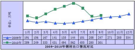 據(jù)海關(guān)快報(bào)統(tǒng)計(jì),9 月份,我國(guó)進(jìn)口鋼材132 萬(wàn)噸,同比下降30.9%,環(huán)比減少3 萬(wàn)噸;出口鋼材301 萬(wàn)噸,同比增長(zhǎng)21.8%,環(huán)比增加21 萬(wàn)噸;凈出口鋼材169 萬(wàn)噸,同比增長(zhǎng)2.02 倍,環(huán)比增加24 萬(wàn)噸;前三季度累計(jì)進(jìn)口鋼材1250 萬(wàn)噸,同比下降6.57%,累計(jì)出口鋼材3394 萬(wàn)噸,同比增長(zhǎng)1.16 倍,累計(jì)凈出口2144 萬(wàn)噸,同比增長(zhǎng)8.2 倍。受國(guó)內(nèi)外價(jià)差減小、退稅政策調(diào)整導(dǎo)致企業(yè)出口成本上升、國(guó)際貿(mào)易保護(hù)主義以及人民幣升值等因素的影響,第四季度出口形勢(shì)仍不容樂觀。