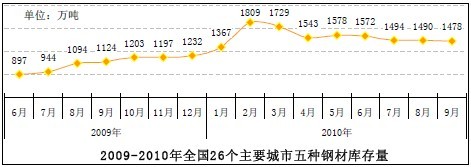 9 月末,全國(guó)26 個(gè)主要鋼材市場(chǎng)五種鋼材社會(huì)庫(kù)存量合計(jì)為1478 萬(wàn)噸,環(huán)比減少12萬(wàn)噸,降幅0.81%;同比上升31.5%。