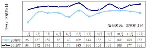 水泥產(chǎn)量高位回落。據(jù)統(tǒng)計(jì) 2010 年12 月水泥產(chǎn)量 16996.2 萬(wàn)噸,同比增長(zhǎng) 16.4%,日均產(chǎn)量環(huán)比下降 6.85%,2010 年全年累計(jì)水泥產(chǎn)量 18.68 億噸,同比增長(zhǎng) 15.5%。
