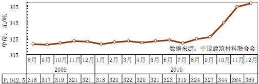 進(jìn)入 2010 年 12 月,水泥價(jià)格繼續(xù)上漲,漲幅趨緩。據(jù)統(tǒng)計(jì),12 月重點(diǎn)聯(lián)系水泥企業(yè)42.5 級(jí)普通硅酸鹽水泥平均價(jià)格為 368.9 元/噸,環(huán)比增長(zhǎng) 1.3%,比年初上漲 16.1%,同比增長(zhǎng) 15.0%。