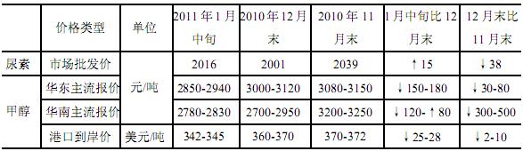 表 1 2010年 12月-2011 年 1 月尿素、甲醇市場價格情況