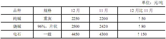 3.純堿產(chǎn)量環(huán)比、同比均迅速下降;燒堿產(chǎn)量環(huán)比小幅下降,同比平穩(wěn)增長。根據(jù)國家統(tǒng)計局數(shù)據(jù),12 月純堿產(chǎn)量 161.4萬噸,同比下降 15.8%,日均產(chǎn)量環(huán)比下降 8.4%,1-12月累計產(chǎn)量 2029.3 萬噸,同比增長 4.2%;燒堿產(chǎn)量 183.0 萬噸,同比增長 4.3%,日均產(chǎn)量環(huán)比下降 3.3%,1-12 月累計產(chǎn)量 2086.7 萬噸,同比增長 12.8%。