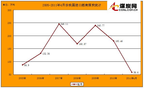 2005-2011年4月份我國(guó)進(jìn)口越南煤炭統(tǒng)計(jì)圖