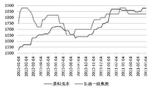 由于焦化行業(yè)產(chǎn)能較為分散,產(chǎn)業(yè)集中度低,產(chǎn)能優(yōu)勢并沒有轉(zhuǎn)化為價(jià)格優(yōu)勢,尤其近幾年受上游高價(jià)焦煤和下游強(qiáng)勢鋼企夾擊的焦炭企業(yè)經(jīng)濟(jì)效益不容樂觀。一般焦炭的原料成本占到焦炭總成本的90%以上,我們以呂梁離石焦精煤(45%)、臨汾霍州肥精煤(15%)、長治郊區(qū)的廋精煤(30%)以及忻州寧武的氣精煤(10%)來計(jì)算焦炭的原料成本。從下圖可以知道,焦炭的原料成本基本接近焦炭的現(xiàn)貨價(jià)格,但需要注意的是,在現(xiàn)實(shí)中焦化企業(yè)采購的煉焦煤價(jià)格往往比市場價(jià)格低,如果除去這部分差價(jià),應(yīng)該說焦炭的原料成本低于現(xiàn)貨100—200元的價(jià)差。