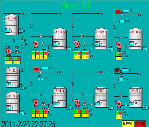 此系統(tǒng)主要控制三個灌區(qū)分別是北罐區(qū)、南罐區(qū)、舊罐區(qū),每個罐區(qū)都對應不同的泵和閥門,罐區(qū)內(nèi)裝車都有計量系統(tǒng),當計量流量發(fā)出到達信號時相對應的閥門和泵關閉,同時當每個罐區(qū)內(nèi)液位、溫度出現(xiàn)低報警、低低報警、高報警、高高報警時進行相應的連鎖動作。