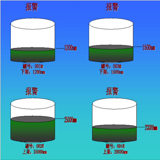 狀態(tài)報警是顯示罐內(nèi)液位超限位的狀態(tài),如罐號設定的上/下限值及液位實時值,例如:當液位低于下限一定值時表示油罐已空,高于一定值時油罐已滿,并根據(jù)需求設定遠端報警,趨勢圖可實時顯示溫度及液位的趨勢狀態(tài),報警信息如圖3-2所示。