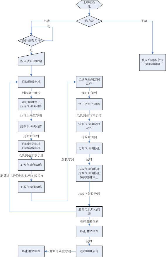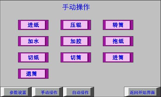 花炮卷筒機(jī)的動作主要有:送紙、壓輥、抱紙、卷筒、加水、加膠、切紙、切筒、進(jìn)筒燈一系列工序。根據(jù)工序的特點,在PLC的控制程序里有手動和自動控制兩種控制模式。在手動控制模式下,可以單獨對每一個工序的動作進(jìn)行控制;當(dāng)切換到自動控制模式,PLC程序會根據(jù)預(yù)先設(shè)置好的流程來控制卷筒機(jī)工作,不需要人工干預(yù)。所有的這些手動操作和手/自動信號的切換都是通過觸摸屏進(jìn)行的。