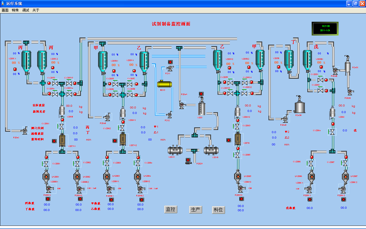 試劑配置控制系統(tǒng)是根據(jù)生產(chǎn)需要選擇相應(yīng)的試劑根據(jù)設(shè)定好的重量,按種類分先后稱重,控制每種試劑的快慢出液閥開關(guān)和每種試劑配置的先后順序,實(shí)現(xiàn)精確稱重。將稱重好的試劑進(jìn)行攪拌,輸送到指定配置倉,根據(jù)實(shí)際情況通過試劑投加泵進(jìn)行對粉料投加。