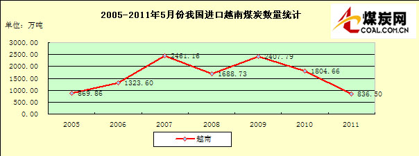 2005-2011年5月份我國(guó)進(jìn)口越南煤炭數(shù)量統(tǒng)計(jì)