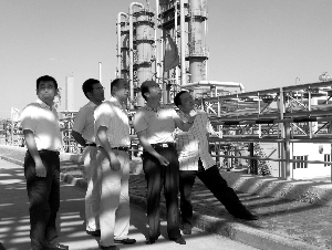 圖為日前在陜西調(diào)研的中國石油和化學工業(yè)聯(lián)合會常務副會長李壽生(右三)在該公司董事長任沛建(右二)陪同下,了解12萬噸/年煤焦油全餾分加氫裝置情況。