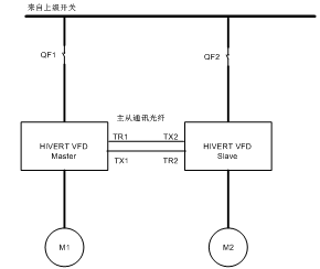 雙機(jī)聯(lián)動(dòng)同步運(yùn)行變頻系統(tǒng)是由完全獨(dú)立的兩臺(tái)變頻器通過主、從機(jī)的同步通訊方式保證雙電機(jī)的轉(zhuǎn)速、以及功率平衡的。兩臺(tái)電機(jī)中任意一臺(tái)都可作為主機(jī),另一臺(tái)為從機(jī)。