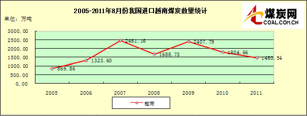 2005-2011年8月份我國進口越南煤炭數(shù)量走勢統(tǒng)計