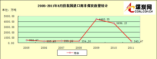 2005-2011年8月份我國(guó)進(jìn)口南非煤炭數(shù)量走勢(shì)統(tǒng)計(jì)