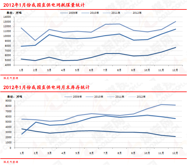 2012年1月全國重點發(fā)電企業(yè)耗煤/庫存情況 | |||||||||||