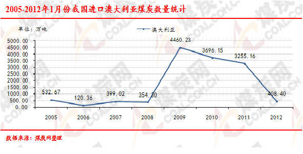 2005-2012年1月份我國進口澳大利亞煤炭數(shù)量走勢統(tǒng)計