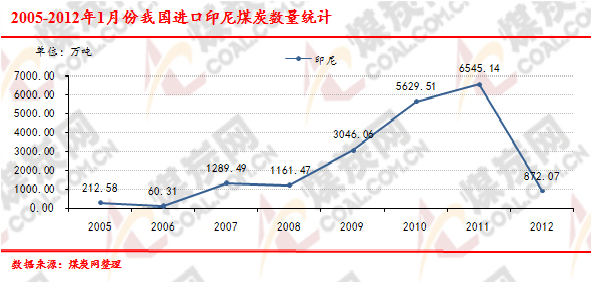 2005-2012年1月份我國進口印尼煤炭數量走勢統(tǒng)計