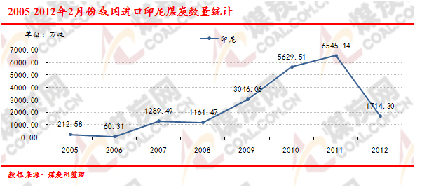 2005-2012年2月份我國進(jìn)口印尼煤炭數(shù)量走勢統(tǒng)計(jì)