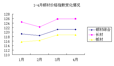 受雙節(jié)集中影響,1月份國內(nèi)鋼材市場需求減弱,庫存增多,鋼材價格出現(xiàn)下滑;2月份,市場需求未見明顯增長,鋼材價格繼續(xù)下行,CSPI綜合價格指數(shù)降至118.47點;3月份開始受季節(jié)性需求回暖的影響,鋼材價格出現(xiàn)小幅度上調(diào),CSPI綜合價格指數(shù)一度升至121.18點;4月份,鋼材價格升幅減小,CSPI綜合價格指數(shù)達到121.19點。