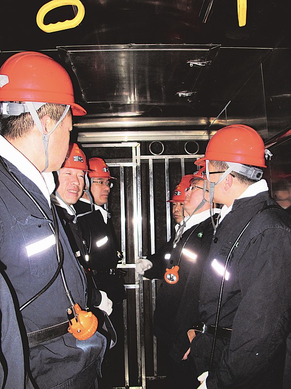 入井口猶如賓館的大廳,雪白的地板磚一塵不染,幾乎能照出人影,兩側(cè)是各種企業(yè)文化、安全常識的展板,以及各種有關(guān)煤的工藝品。走過“洗靴池”,記者和礦工們依次登上罐籠直線而下,“罐籠”是運送礦工下井的升降梯,大約不到一分鐘,罐籠就把我們送到了地下300米的井底。