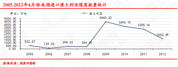 2005-2012年4月份我國(guó)進(jìn)口澳大利亞煤炭數(shù)量走勢(shì)統(tǒng)計(jì)