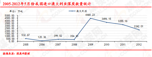 2005-2012年5月份我國(guó)進(jìn)口澳大利亞煤炭數(shù)量走勢(shì)統(tǒng)計(jì)