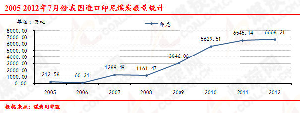 2005-2012年7月份我國進(jìn)口印尼煤炭數(shù)量走勢(shì)統(tǒng)計(jì)