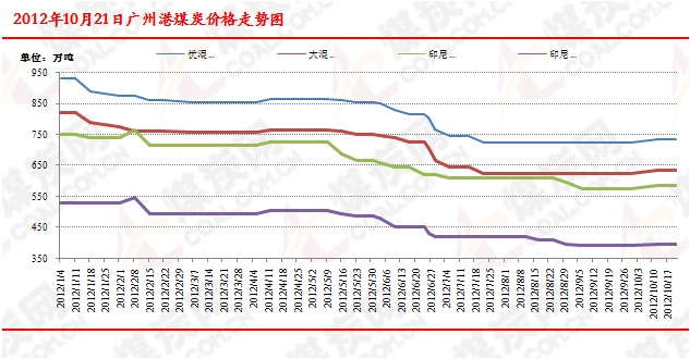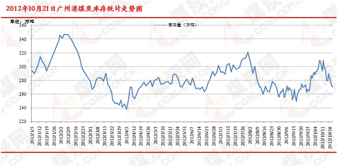 港口庫存方面:煤炭網(wǎng)信息研究中心數(shù)據(jù)顯示,截止到10月21日,廣州港存煤存煤270.25萬噸,周環(huán)比減少27.02萬噸。其中新沙公司存煤141萬噸;周環(huán)比減少11萬噸;西基公司存煤58萬噸,周環(huán)比減少5萬噸;新港公司存煤14.92萬噸,環(huán)比減少9.31萬噸;黃埔公司存煤56.33萬噸,環(huán)比減少1.71萬噸。