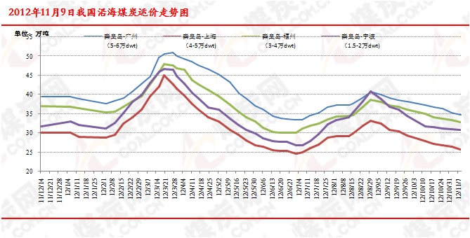 沿海運(yùn)費(fèi):截止到11月9日,現(xiàn)秦皇島港-廣州港(5-6萬DWT)運(yùn)費(fèi)34.7元/噸,較2日下跌0.6元;秦皇島-福州(3-4萬DWT)運(yùn)費(fèi)32.8元/噸,下跌0.6元。天津-上海(2-3萬DWT)運(yùn)價(jià)29.5元/噸,回落0.2元;天津-鎮(zhèn)江(1-1.5萬DWT)運(yùn)價(jià)35.6元/噸,回落0.3元;秦皇島-寧波(1.5-2萬DWT)運(yùn)價(jià)30.8元/噸,下降0.1元。截止到11月9日沿海六大電廠存煤總量為1387.1萬噸,周環(huán)比減少22.37萬噸;存煤可用天數(shù)為22.22天,較上周同期減少1.84天。本期沿海煤炭運(yùn)價(jià)出現(xiàn)企穩(wěn)跡象,但是由于上漲動(dòng)力不足,利好因素難以支撐運(yùn)價(jià)回升。主要由于前期沿海運(yùn)價(jià)已經(jīng)連續(xù)下跌2月,運(yùn)價(jià)已經(jīng)跌至船東心理底線。長時(shí)間的低位運(yùn)價(jià)迫使部分船東選擇停運(yùn)或者進(jìn)行船舶檢修,造成市場運(yùn)力短暫回避、運(yùn)價(jià)緩慢筑底。另一方面由于氣溫的偏低使得沿海地區(qū)對(duì)下水煤炭的需求有所提高,增加對(duì)北方煤炭或進(jìn)口煤炭的采購動(dòng)作,增強(qiáng)運(yùn)價(jià)上漲預(yù)期。綜合分析認(rèn)為隨著冬儲(chǔ)煤的進(jìn)行,下游企業(yè)煤炭庫存持續(xù)偏高,以及日耗偏低的特征影響,又使得沿海運(yùn)輸受阻,制約著運(yùn)價(jià)的回暖,目前航運(yùn)市場供大于求的現(xiàn)象依然存在,預(yù)計(jì)后期沿海運(yùn)價(jià)將繼續(xù)受到壓制。