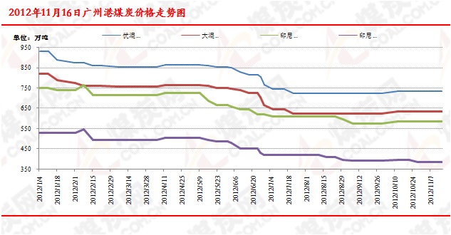 【動力煤市場】本周廣州港煤炭市場穩(wěn)定運行,港口存煤繼續(xù)呈現(xiàn)增長態(tài)勢,逼近300萬噸。內(nèi)外貿(mào)煤炭價格繼續(xù)持穩(wěn),沒有明顯變化。 印尼煤炭市場受上周價格下跌的影響,成交情況并沒有有所提升。隨著北方動力煤市場價格的下跌,沿海動力煤市場的持續(xù)低迷,加上進口印尼煤的價格優(yōu)勢在國內(nèi)已逐漸變?nèi),年底前國?nèi)煤炭價格回升的幾率較小。截止到11月16日,廣州港存煤297.89萬噸,較上周同期上漲19.17萬噸,F(xiàn)港口內(nèi)貿(mào)煤炭價格維持穩(wěn)定,其中山西優(yōu)混5500大卡港口庫提價725元/噸,山西大混山5000大卡港口庫提價630-640元/噸;大混4500大卡港口庫提價545-555元/噸。神木優(yōu)混1號Q5500A12V28S0.3港口庫提價750元/噸,神木塊煤Q6100A4V28S0.2港口庫價1020元/噸。外貿(mào)煤方面:現(xiàn)澳洲煤Q5000大卡港口庫提價610-620元/噸;Q5500大卡CIF價650元/噸;印尼煤Q4700大卡港口到岸參考價580-590元/噸,Q3800大卡港口庫提價380-390元/噸;越南洪基11AQ4800大卡港口庫提價600-610元/噸。截止到目前印尼至中國南部沿海的煤炭運費保持穩(wěn)定,目前印尼加里曼丹港-廣州港(5-6萬噸)運價8.5美元/噸,較上期下跌0.5美元,印尼加里曼丹港-廣州港(6-7萬噸)運價7.5美元/噸,較上期保持穩(wěn)定。