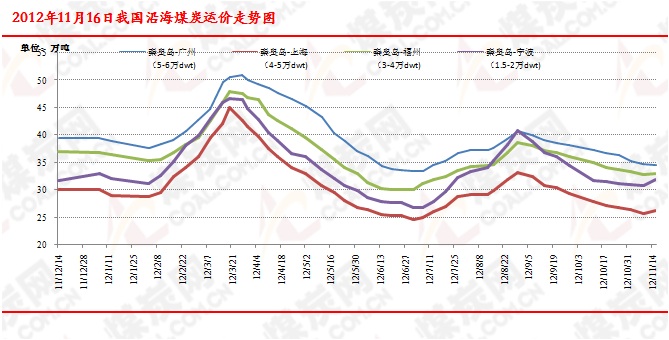 沿海運費:截止到11月16日,現(xiàn)秦皇島港-廣州港(5-6萬DWT)運費34.6元/噸,較9日下跌0.1元;秦皇島-福州(3-4萬DWT)運費33元/噸,微漲0.2元。天津-上海(2-3萬DWT)運價30元/噸,回升0.5元;天津-鎮(zhèn)江(1-1.5萬DWT)運價37.3元/噸,回升1.7元;秦皇島-寧波(1.5-2萬DWT)運價31.8元/噸,回升1元。截止到11月16日沿海六大電廠存煤總量為1399萬噸,周環(huán)比增加12萬噸;存煤可用天數(shù)為22.35天,較上周同期增加0.13天。本期沿海煤炭運價均出現(xiàn)弱勢回暖的局面,漲勢情況表現(xiàn)不一。一方面由于前期持續(xù)下跌的運價已經(jīng)跌至船東的成本線上,運價繼續(xù)下跌的空間有限,部分船東采取封航停運來削減市場剩余運力。另一方面,需求不足使得運輸市場貨源減少,租船成交清淡,對運價的上漲預(yù)期形成制約。本期運價上漲主要集中在短途的小型船舶上面,大型運輸船舶運價繼續(xù)呈現(xiàn)弱勢下探,不過下探幅度已經(jīng)陸續(xù)縮小。目前沿海運輸價格的上漲和下跌勢頭仍不明朗,預(yù)計近期運價將呈現(xiàn)底部震蕩趨勢,運價的回暖要等到冬季用煤需求提升等利好因素的進一步刺激。
