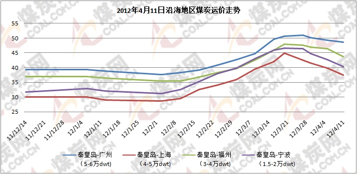 煤炭網(wǎng)信息研究中心數(shù)據(jù)顯示:截止到4月11日,秦皇島至廣州(5-6萬(wàn)DWT)運(yùn)價(jià)48.6元/噸,較30日下跌1.5元/;秦皇島至福州(3-4萬(wàn)DWT)運(yùn)價(jià)43.8元/噸,較30日下跌3.1元;秦皇島至張家港(2-3萬(wàn)DWT)運(yùn)價(jià)41.9元/噸,較30日下跌4.2元;天津港至上海(2-3萬(wàn)DWT)運(yùn)價(jià)39.2元/噸,較30日下跌4.2元。