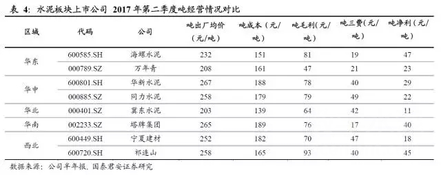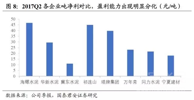 噸凈利看,龍頭海螺水泥Q2為47元/噸,西北的祁連山為45元/噸(主要是成本煤炭較低,噸毛利高導(dǎo)致),華南的塔牌集團為40元/噸,而華北的冀東水泥,西北的寧夏建材噸凈利為11元/噸、18元/噸。