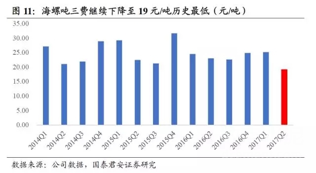 以海螺水泥為例,在今年整體行業(yè)供給側(cè)改革蔓延的情況下,產(chǎn)能利用率依然保持93%以上,繼續(xù)深化管理降低負債率,Q2噸期間費用下降至19元/噸的歷史最低位。