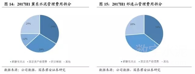 對比受錯峰停產(chǎn)政策影響的華北、西北企業(yè)看,冀東水泥、同力水泥、祁連山、寧夏建材噸三費均在40元/噸以上。以冀東為例,上半年銷量同比下滑19%,導(dǎo)致管理費用中固定資產(chǎn)折舊及停產(chǎn)停窯修理費占比超過40%;祁連山修理費占比也接近40%,而對比海螺、塔牌兩家企業(yè),修理折舊占比分別為13%、23%。