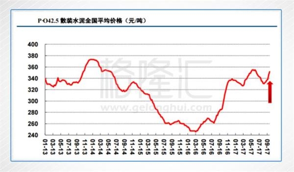 全國有20個(gè)省市自治區(qū)的P.O42.5散裝水泥價(jià)格環(huán)比上漲,水泥價(jià)格也正式步入新一波的升軌(上圖紅箭頭所示)。