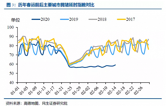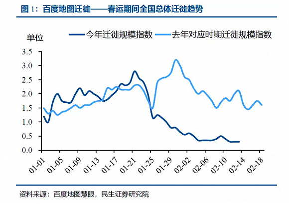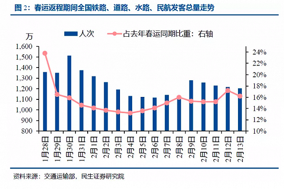 民生宏觀在日前發(fā)布的一份研報(bào)中從包括全國(guó)春運(yùn)遷移指數(shù)、全國(guó)鐵路、道路、水路、民航發(fā)客總量在內(nèi)的六個(gè)角度分析了當(dāng)前的復(fù)工進(jìn)度。