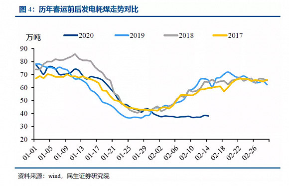 大年初九以來(lái)發(fā)電耗煤量明顯低于往年同期。根據(jù)6大發(fā)電集團(tuán)發(fā)電耗煤量走勢(shì),今年春節(jié)第二周以來(lái),日均發(fā)電耗煤量明顯低于往年春節(jié)同期,至今沒(méi)有向上趨勢(shì)。發(fā)電耗煤量走勢(shì)反映工業(yè)生產(chǎn)情況,發(fā)電耗煤量持續(xù)低迷體現(xiàn)出工業(yè)領(lǐng)域復(fù)工率較低的事實(shí)。