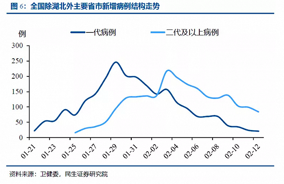 非湖北地區(qū)二代以上病例占比在提升,復(fù)工后防疫壓力較大。對(duì)全國(guó)主要省市而言,隨著自春節(jié)以來(lái)14天隔離期結(jié)束,非湖北地區(qū)新增一代病例(湖北輸入型病例)逐漸下降,但新增二代以上病例占比逐漸增多,成為新增病例主要來(lái)源。說(shuō)明新冠肺炎在全國(guó)非湖北地區(qū)有二次傳播的現(xiàn)象。