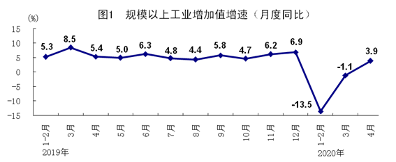 4月份,全國規(guī)模以上工業(yè)增加值同比增長3.9%,3月份為下降1.1%;環(huán)比增長2.27%。1-4月份,全國規(guī)模以上工業(yè)增加值同比下降4.9%,降幅比1-3月份收窄3.5個(gè)百分點(diǎn)。4月份,分經(jīng)濟(jì)類型看,國有控股企業(yè)增加值增長0.5%;股份制企業(yè)增長4.0%,外商及港澳臺(tái)商投資企業(yè)增長3.9%;私營企業(yè)增長7.0%。分三大門類看,采礦業(yè)增加值增長0.3%;制造業(yè)增長5.0%,3月份為下降1.8%;電力、熱力、燃?xì)饧八a(chǎn)和供應(yīng)業(yè)增長0.2%。高技術(shù)制造業(yè)和裝備制造業(yè)增長較快。4月份,高技術(shù)制造業(yè)和裝備制造業(yè)增加值分別增長10.5%和9.3%,快于規(guī)模以上工業(yè)6.6和5.4個(gè)百分點(diǎn)。從產(chǎn)品產(chǎn)量看,光纜,挖掘、鏟土運(yùn)輸機(jī)械,集成電路,工業(yè)機(jī)器人,微型計(jì)算機(jī)設(shè)備產(chǎn)量同比分別增長43.8%、40.8%、29.2%、26.6%、26.2%。