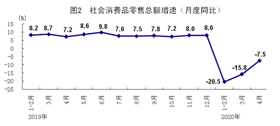 4月份,社會(huì)消費(fèi)品零售總額28178億元,同比下降7.5%,降幅比3月份收窄8.3個(gè)百分點(diǎn);環(huán)比增長0.32%。1-4月份,社會(huì)消費(fèi)品零售總額106758億元,同比下降16.2%,降幅比1-3月份收窄2.8個(gè)百分點(diǎn)。4月份,按經(jīng)營單位所在地分,城鎮(zhèn)消費(fèi)品零售額24558億元,同比下降7.5%;鄉(xiāng)村消費(fèi)品零售額3620億元,下降7.7%。按消費(fèi)類型分,餐飲收入2307億元,下降31.1%;商品零售25871億元,下降4.6%;旧铑惿唐份^快增長,4月份,限額以上單位商品零售額中,糧油食品類和飲料類同比分別增長18.2%和12.9%。消費(fèi)升級(jí)類商品銷售改善,4月份,通訊器材類和文化辦公用品類分別增長12.2%和6.5%,比3月份分別加快5.7和0.4個(gè)百分點(diǎn)。網(wǎng)上零售較為活躍,1-4月份,全國網(wǎng)上零售額30698億元,同比增長1.7%,1-3月份為下降0.8%;其中,實(shí)物商品網(wǎng)上零售額增長8.6%,比1-3月份加快2.7個(gè)百分點(diǎn),占社會(huì)消費(fèi)品零售總額的比重為24.1%,比1-3月份提高0.5個(gè)百分點(diǎn)。