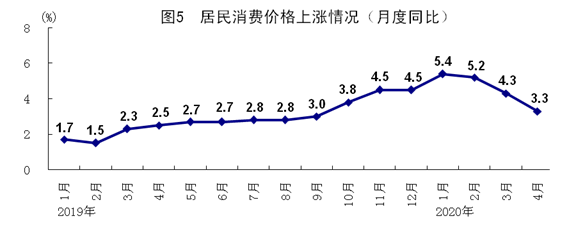 4月份,全國居民消費(fèi)價(jià)格同比上漲3.3%,漲幅比3月份回落1.0個(gè)百分點(diǎn);環(huán)比下降0.9%。1-4月份,全國居民消費(fèi)價(jià)格同比上漲4.5%。分類別看,4月份,食品煙酒價(jià)格同比上漲11.3%,衣著下降0.4%,居住下降0.3%,生活用品及服務(wù)上漲0.1%,交通和通信下降4.9%,教育文化和娛樂上漲2.0%,醫(yī)療保健上漲2.2%,其他用品和服務(wù)上漲4.8%。在食品煙酒價(jià)格中,糧食上漲1.2%,鮮菜下降3.7%,豬肉上漲96.9%,鮮果下降10.5%。扣除食品和能源價(jià)格后的核心CPI上漲1.1%,漲幅比3月份回落0.1個(gè)百分點(diǎn)。