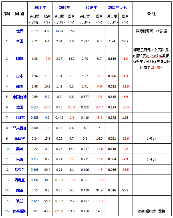 2020年上半年全球主要煤炭進口國和地區(qū)進口情況