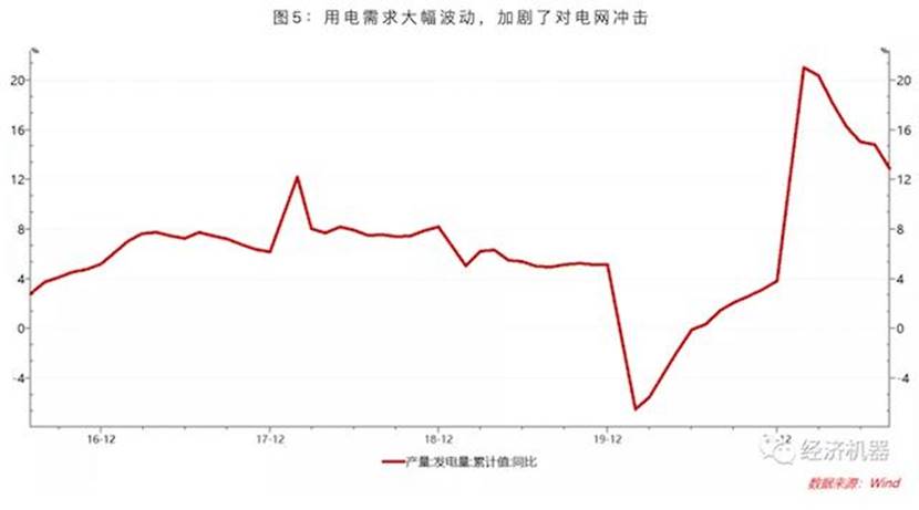 在出口和工業(yè)生產(chǎn)高景氣下,我國發(fā)電量也呈現(xiàn)明顯的V形反彈的態(tài)勢(shì),發(fā)電量累計(jì)同比增速從2020年最低的-8%,快速攀升至今年初最高的19.5%,至今仍有11.3%的漲幅(圖5)。用電需求的暴跌和暴漲,既加劇了動(dòng)力煤價(jià)格的暴漲,也加劇了對(duì)電網(wǎng)的沖擊,使電力階段性短缺具有一定必然性。